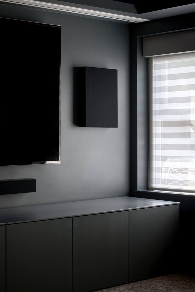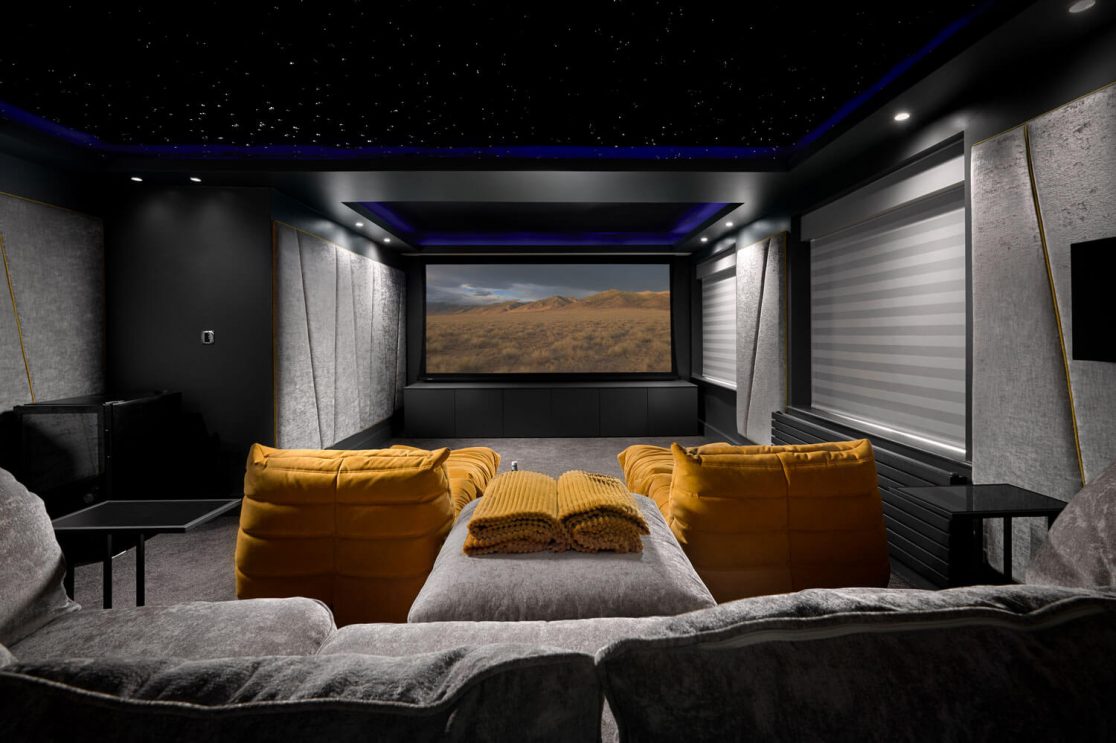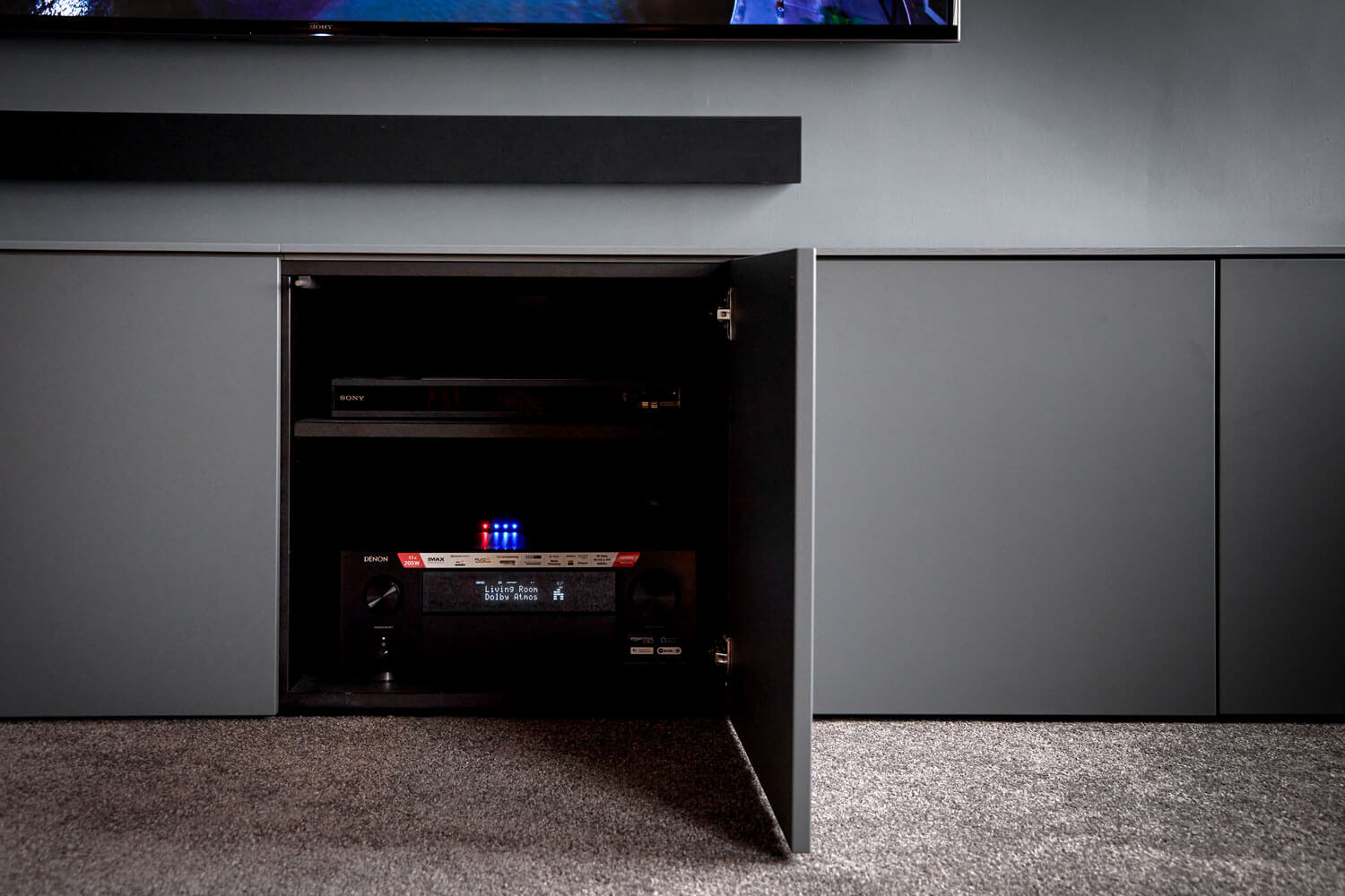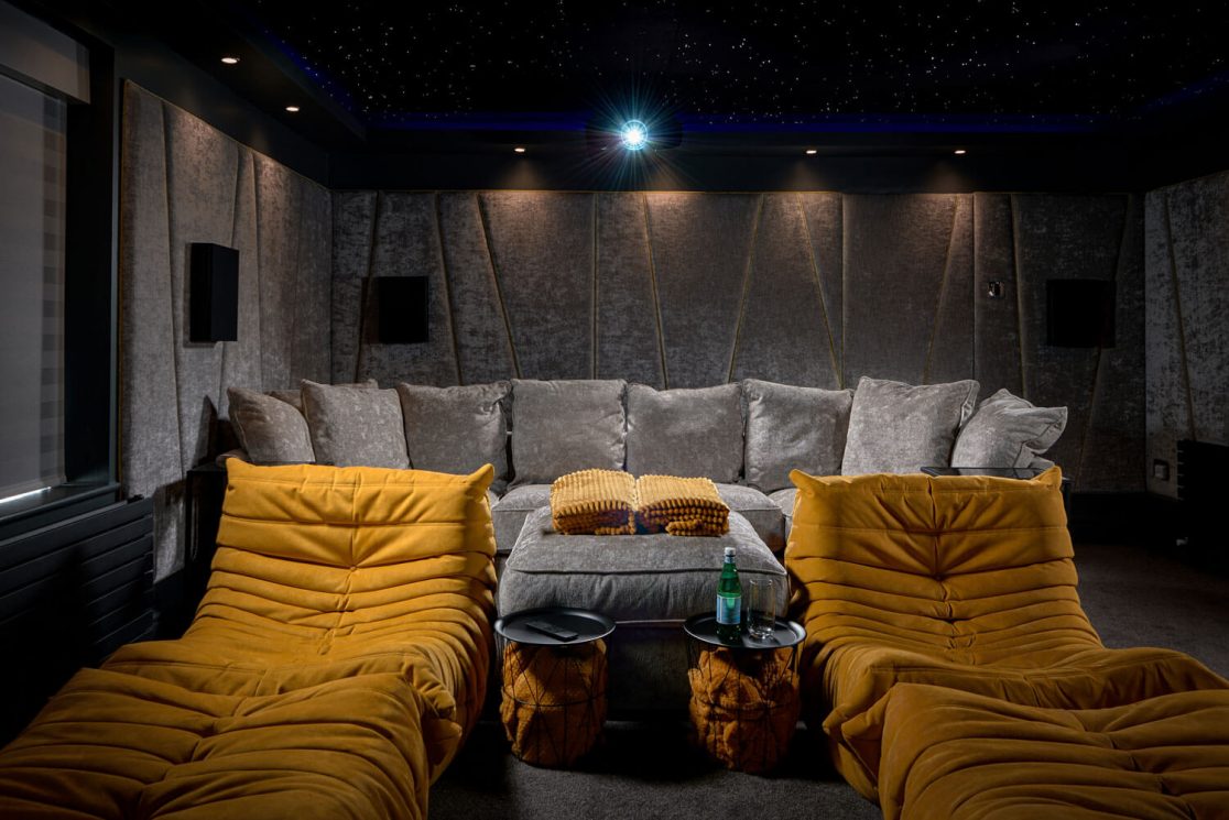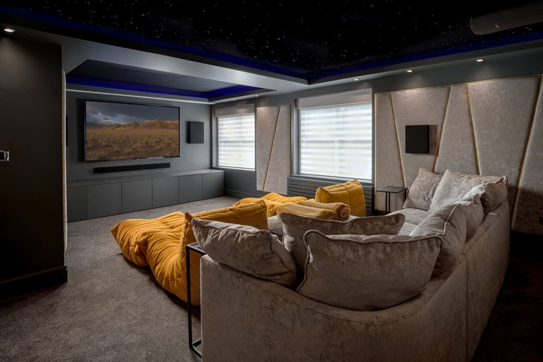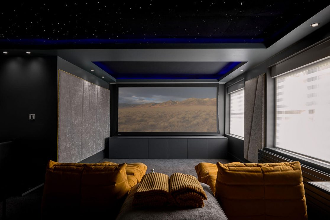 Cre8tive Rooms were approached by a private client in Camberley, Surrey to convert an unused living space into a luxury cinema room. Whilst the client wanted to have the full cinema experience for movies, they also wanted to use the room for more casual viewing of sports and the like. We opted for a Sony TV and a hidden drop down projector screen with Sony 4K projector to make this possible. Similarly with the shades, we opted for Q-Motion dual blinds which have a sheer and total blackout blind giving the client total control of how much light they want to let in. The sound in this room is absolutely epic and works perfectly for all viewing or purely music. The system is a 7.4.2 Dolby Atmos system provided by Artcoustic Loudspeakers. The room also benefits from full Control4 automation and lighting, allowing the spotlights, hidden LEDs and starlight ceiling to be controlled individually or programmed into lighting scenes. A bespoke Hayden Furniture cabinet houses all of the equipment in the room with custom shelving and ventilation to ensure everything remains cool and working as it should be. A dedicated Control4 Neeo remote and Control4 wall switches make using this room an absolute dream. Just one button for cinema mode on which engages the projector, screen, blinds, starlight ceiling and LEDS and one button for room off.