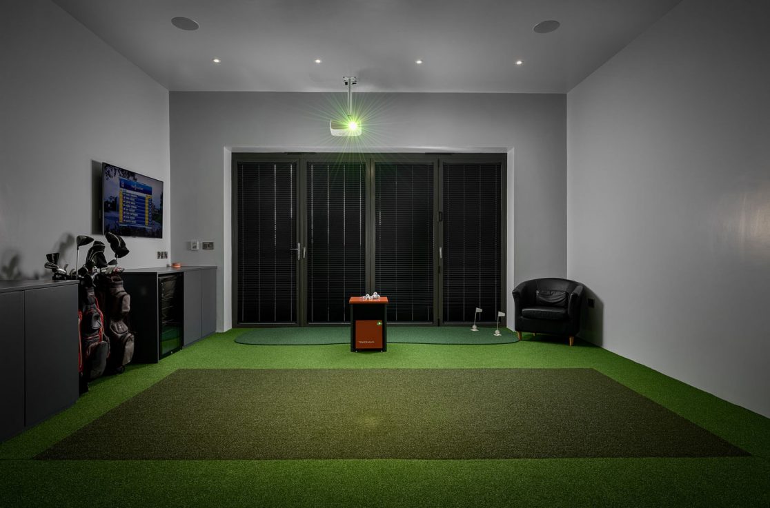 This client reached out to us whilst extending their garage to house a dual-purpose golf simulator and home cinema. After much deliberation, it was decided that the new outbuilding would be used solely for the golf simulator and that a downstairs formal lounge would instead be converted to a luxury cinema room. The client had already browsed the market and purchased their own Trackman hardware but Cre8tive Rooms would take the block-work shell and transform the space into a sleek and professional home simulator. First port-of-call was to bring network from the main house into the new extension. We then installed our signature astro-turf flooring with sunken hitting mat and full-size projector screen. Instead of carpeted walls and ceiling, this simulator has custom upholstered panels fitted around the screen to cushion any missed shots which is a really nice touch. We also supplied a high specification PC to run the Trackman software, as well as a touch screen monitor to control the PC. Bespoke cabinetry was built to house the PC, Trackman launch monitor and drinks fridge as well as provide some additional storage. A TV was mounted adjacent to the touchscreen with full Sky Sports so you can watch live golf and play alongside the professionals. The client is very pleased with the end result and glad they decided to keep the golf and cinema rooms separate. Check out what we did with the home cinema here!