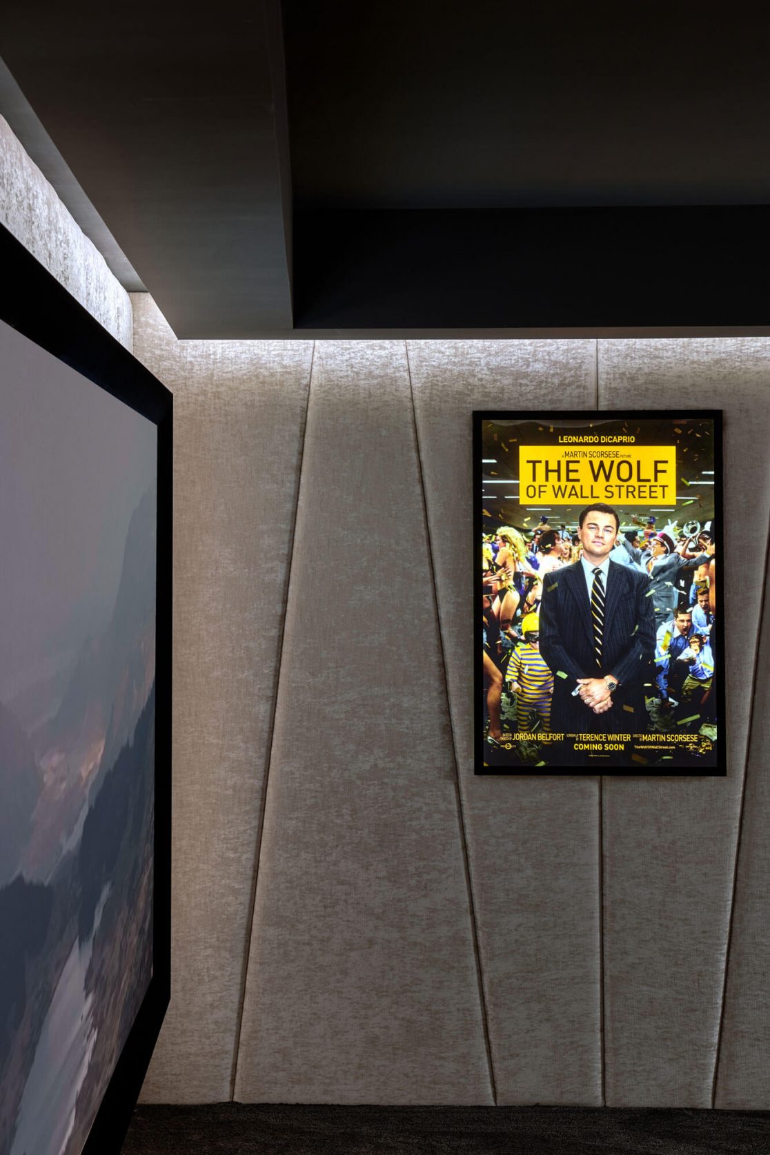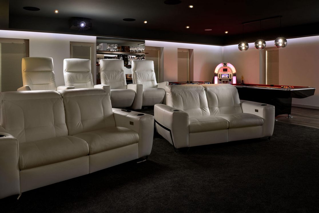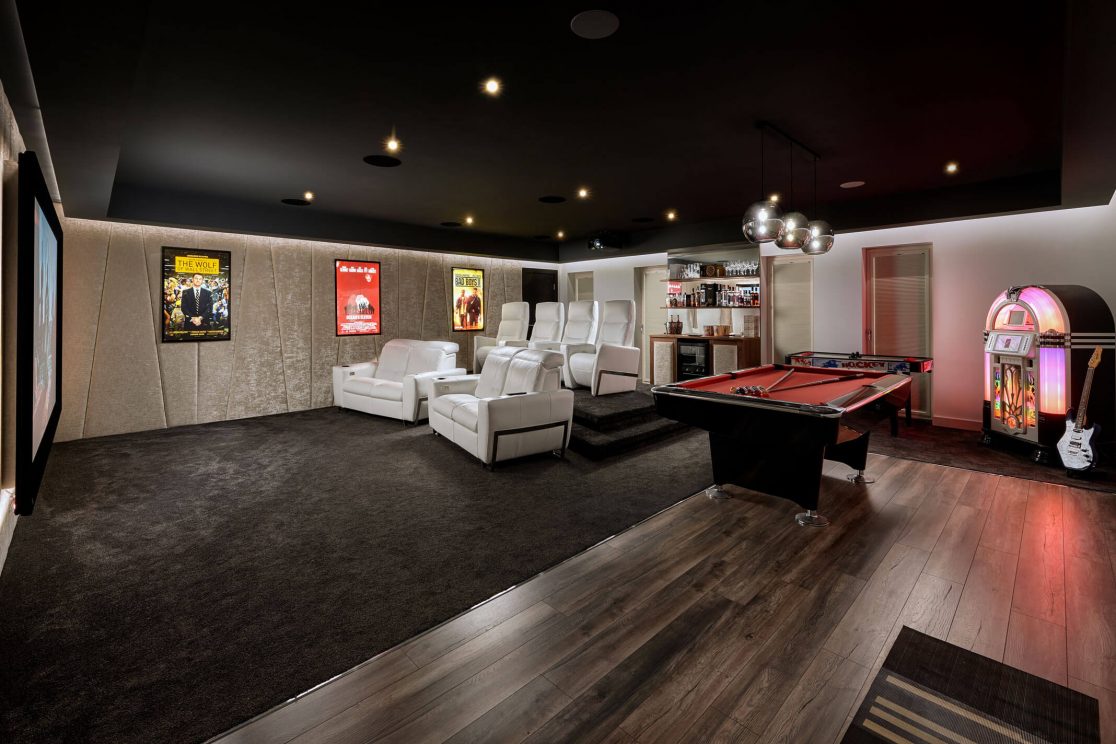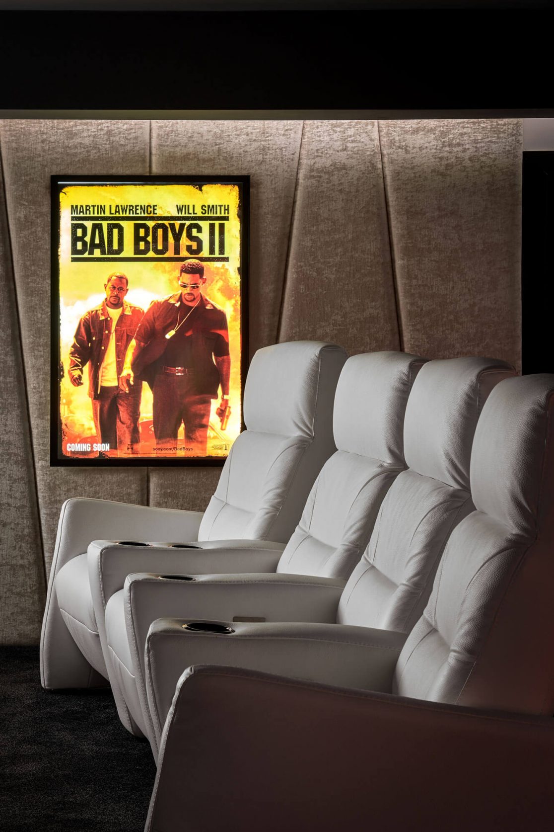 From a design perspective this room features our ever-popular upholstered wall panels in a textured velvet finish with authentic backlit movie posters. We have colour changing LED lighting around the perimeter of the room as well behind the projector screen which creates an awesome floating effect. We have two rows of reclining cinema seats finished in white leather with the second row sitting on a custom raised platform. To the rear of the room, we have some gorgeous bespoke cabinetry which makes up the bar area. This houses a mini drinks fridge with two additional cupboards which are finished in the same fabric as the padded walls. On the games side of the room, we replaced carpet with solid wood flooring to support the pool table as well as create a subtle separation between the two parts of the room.