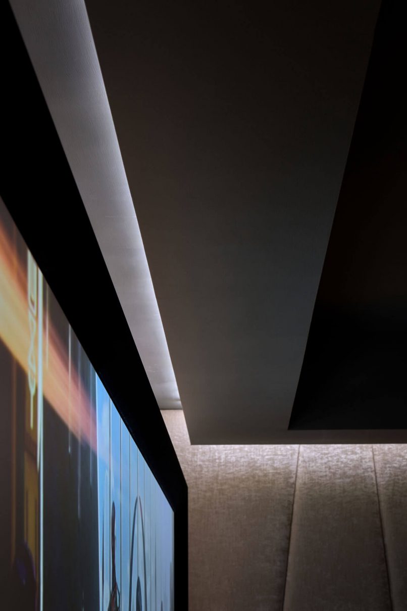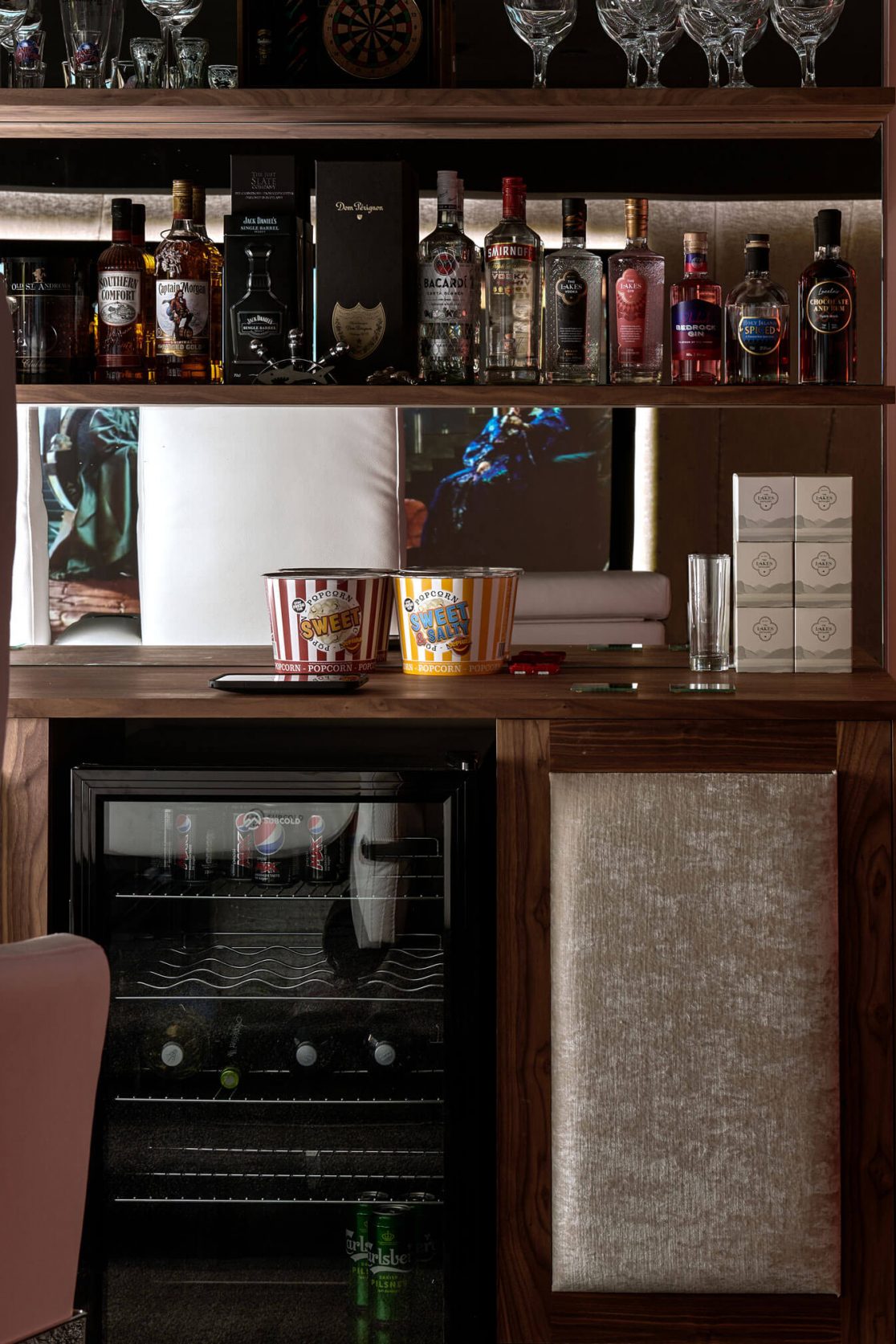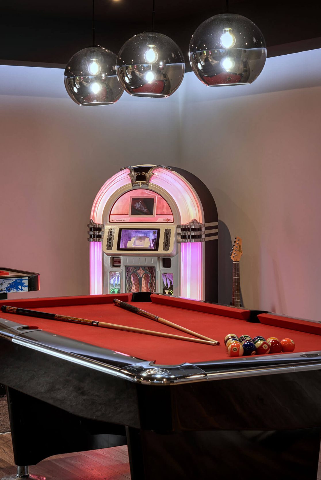 From a design perspective this room features our ever-popular upholstered wall panels in a textured velvet finish with authentic backlit movie posters. We have colour changing LED lighting around the perimeter of the room as well behind the projector screen which creates an awesome floating effect. We have two rows of reclining cinema seats finished in white leather with the second row sitting on a custom raised platform. To the rear of the room, we have some gorgeous bespoke cabinetry which makes up the bar area. This houses a mini drinks fridge with two additional cupboards which are finished in the same fabric as the padded walls. On the games side of the room, we replaced carpet with solid wood flooring to support the pool table as well as create a subtle separation between the two parts of the room.