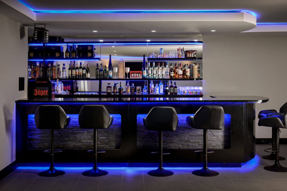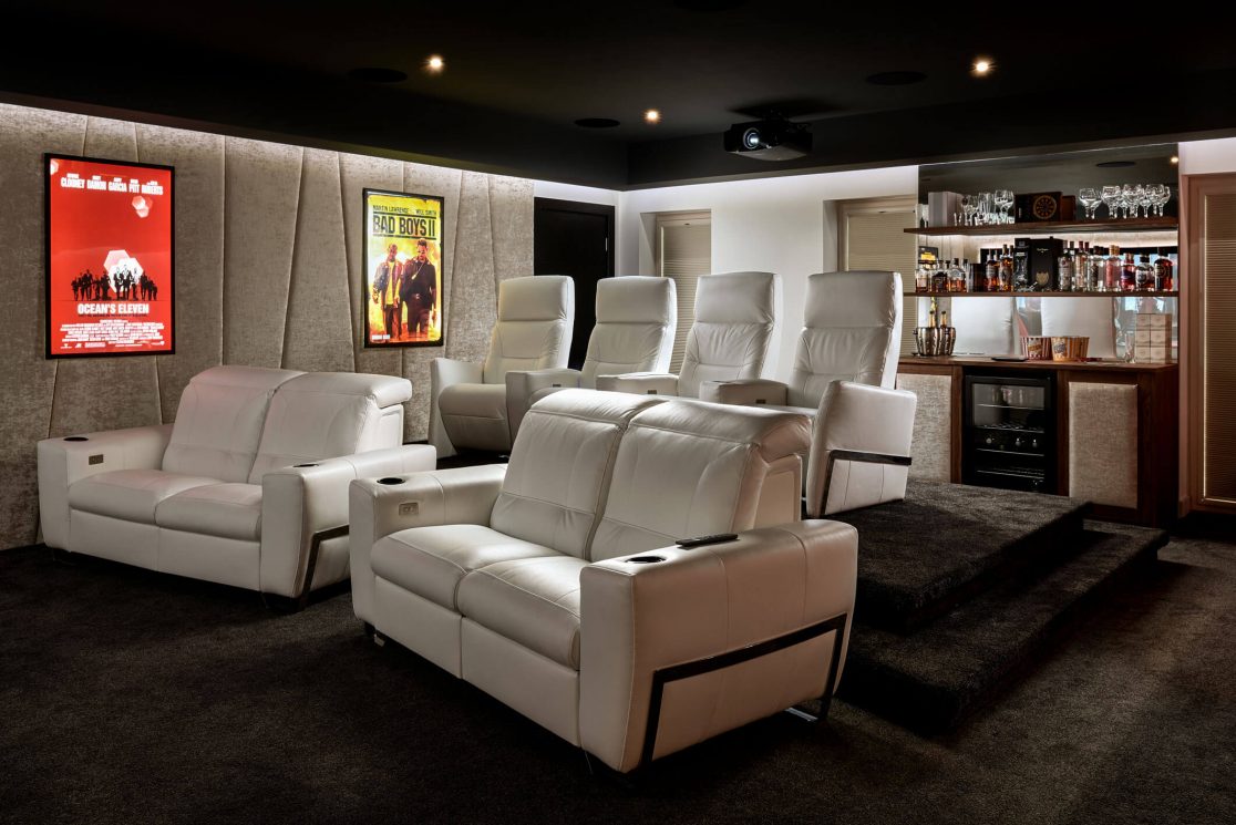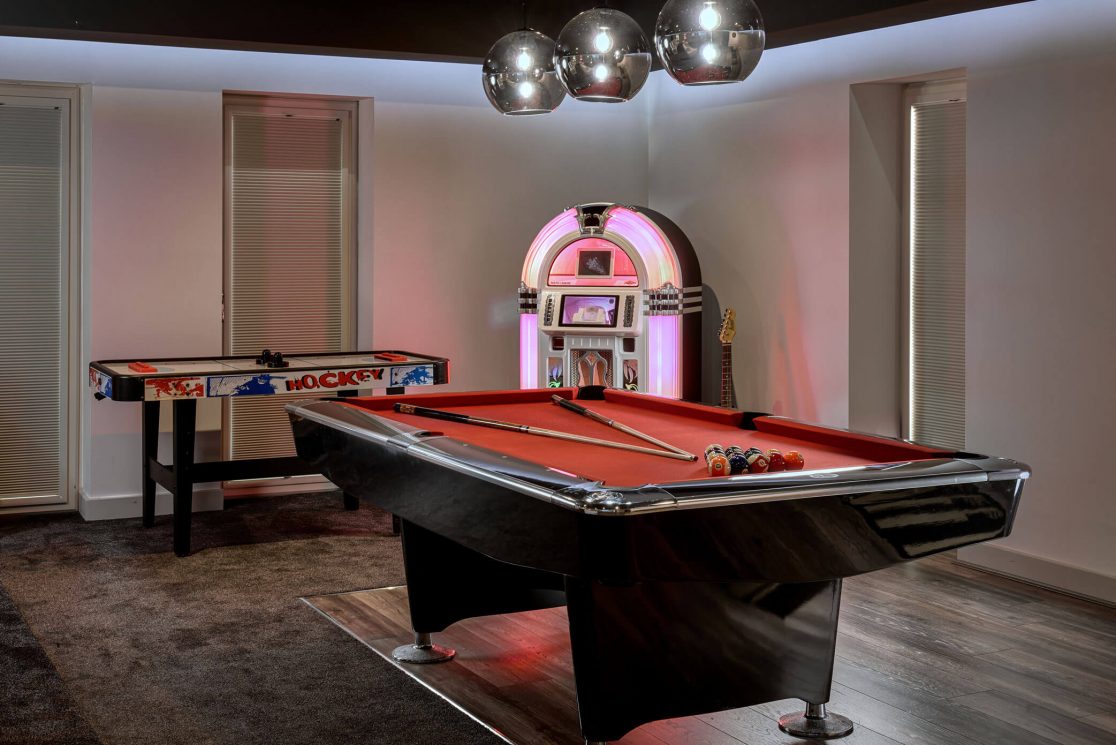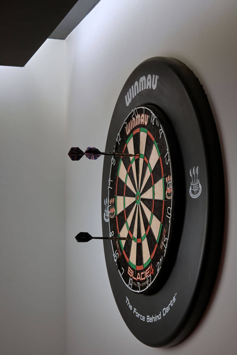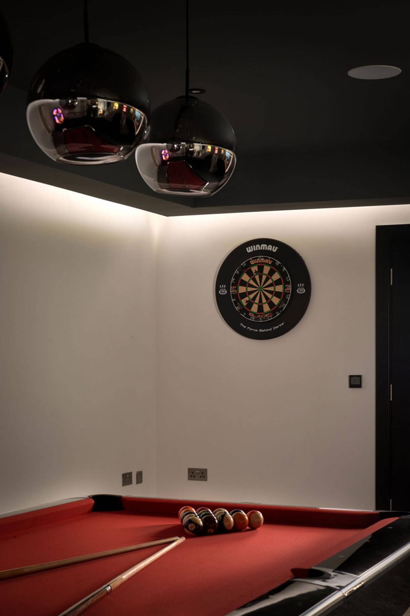 Savant act as the brain of this system controlling and synchronising all the individual technologies. This can be managed using either the dedicated Savant smart remote or on any smart phone or tablet with the Savant app installed. We have dimmable Lutron lighting throughout with separate circuits for the main downlights, the pool table pendants, and a single angled spotlight for the darts board. The cinema features a 9.2 surround sound system powered by Artcoustic with a separate music zone and two additional ceiling speakers for the games area. This equates to three speakers behind the screen, six ceiling speakers and two subwoofers which are hidden beneath the raised seating platform. Whilst this is not a dedicated cinema room in the traditional sense, it still sounds absolutely amazing and packs plenty of punch. Sky and Apple TV are the two main video sources for this room with a widescreen option for movies and 16:9 for regular viewing, all controllable at the touch of a button.
